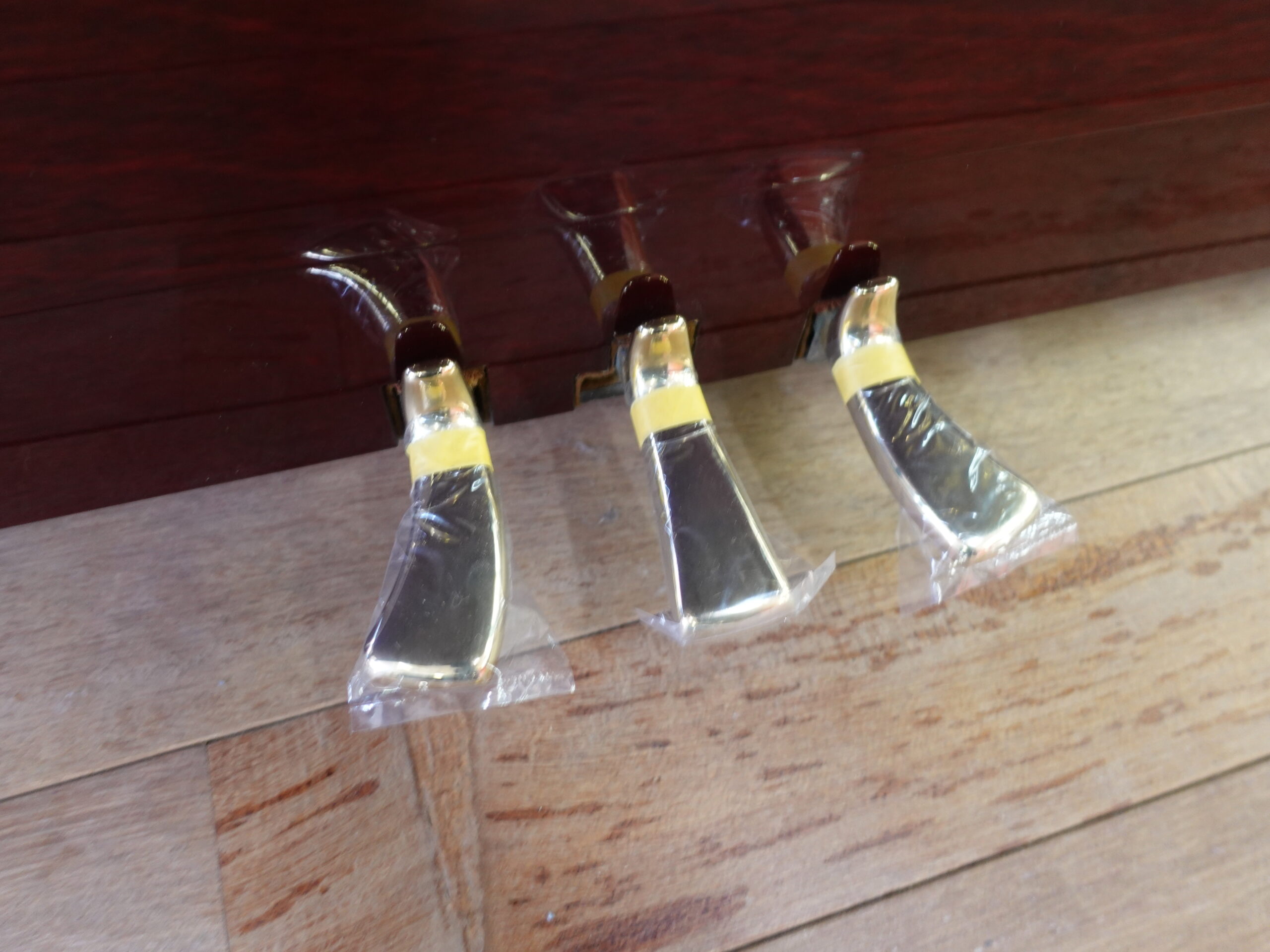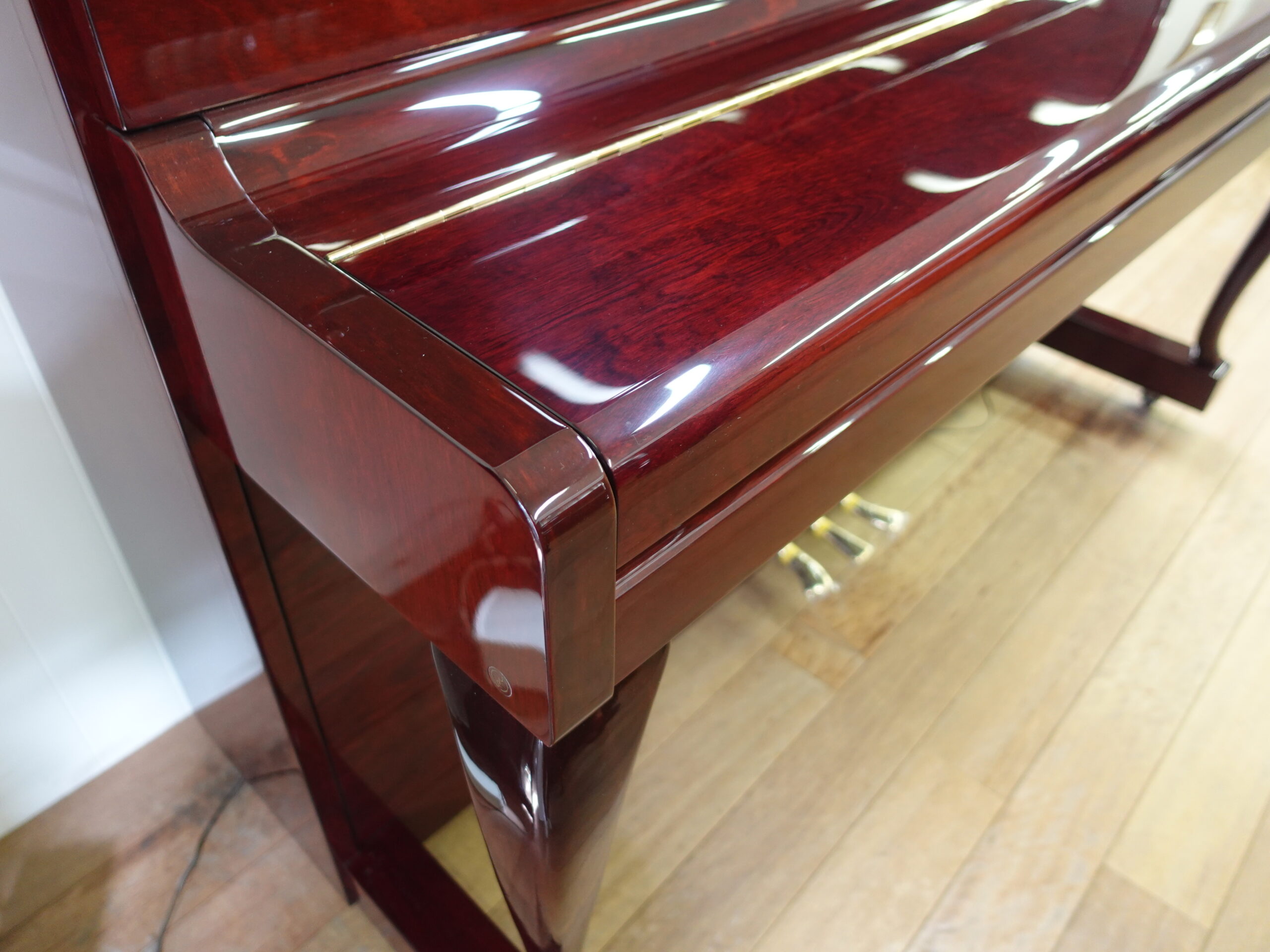 猫脚やモール飾りのデザインが可愛らしい1台です。赤みのある木目も綺麗で目を引かれますが、内部の調整もばっちり仕上げております。消音機能が付いているため、周囲への音漏れが気になる時間帯でも安心です。
