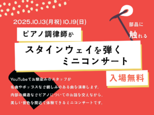 また、実際にピアノの部品にも触っていただく体験コーナーもあり、ピアノの音色や仕組みをより近くで楽しめます。