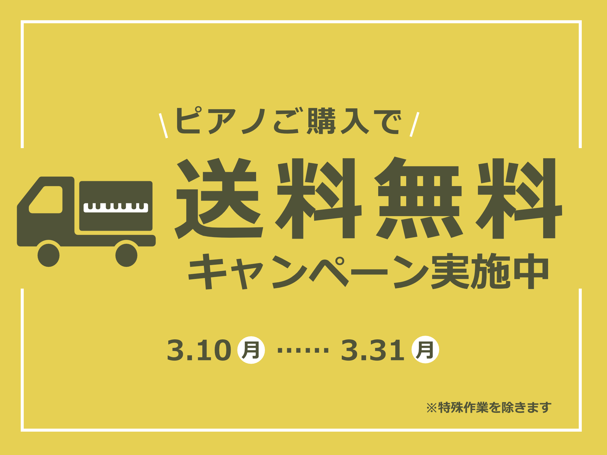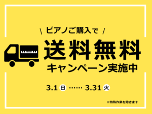 ご好評につき、配送料無料キャンペーンを3月末まで開催いたします。ピアノの購入をご検討中のお客様は、この機会にぜひご来店くださいませ。