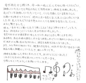 母が祖父から送られ、母→私→娘とずっと大切に弾いてきたピアノ、調律していただけても部品の劣化で限界があり、修理を決断しました。長くピアノを調律していただいて、とても信頼している岩田さんにお願いすることができたので、絶対に良い音色になって戻ってくると信じていましたが、戻ってきたピアノは予想以上にとても素敵な音色になっていて、本当に驚きました。