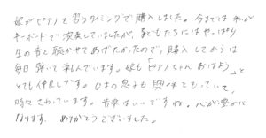 アップライトピアノご購入・中古ピアノ・ヤマハ 2025.06.13 子どもたちには生の音を聴かせてあげたかった(中古ピアノ/ヤマハ/U3E/東郷町) (東郷町からのお客様) ご購入者様からのメッセージ 娘がピアノを習うタイミングで購入しました。今までは私がキーボードで演奏していましたが、子どもたちにはやっぱり生の音を聴かせてあげたかったので、購入してからは毎日弾いて楽しんでいます。娘も「ピアノちゃんおはよう」と、とても仲良しです。0才の息子も興味を持っていて、時々さわっています。音楽はいいですね。心が豊かになります。ありがとうございました。 スタッフの対応は満足のいくものでしたか? 満足 当社でピアノを買う決め手となったポイントをお聞かせください。 価格、品揃え、技術面の信頼、展示ピアノの品質 当社のSNSで、参考になったものや便利だったものはありましたか? Instagram(ショールーム)、Instagram(工房)、 担当者から この度はピアノをご購入いただき、誠にありがとうございます。 娘さんがピアノと仲良しで、毎日弾いていただいているというのは、大変嬉しいです。ピアノも習い始めたということですので、これからが楽しみですね。音楽っていいですよね。私も日々そのように思っています。また調律の際には、よろしくお願いいたします。