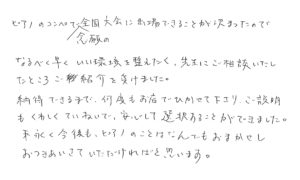 ピアノのコンペで念願の全国大会に出場できることが決まったので、なるべく早くいい環境を整えたく、先生にご相談いたしたところ、ご紹介を受けました。納得できるまで、何度もお店でひかせて下さり、ご説明もくわしくていねいで、安心して選択することができました。末長く今後も、ピアノことはなんでもおまかせし、おつきあいさせていただければと思います。