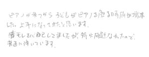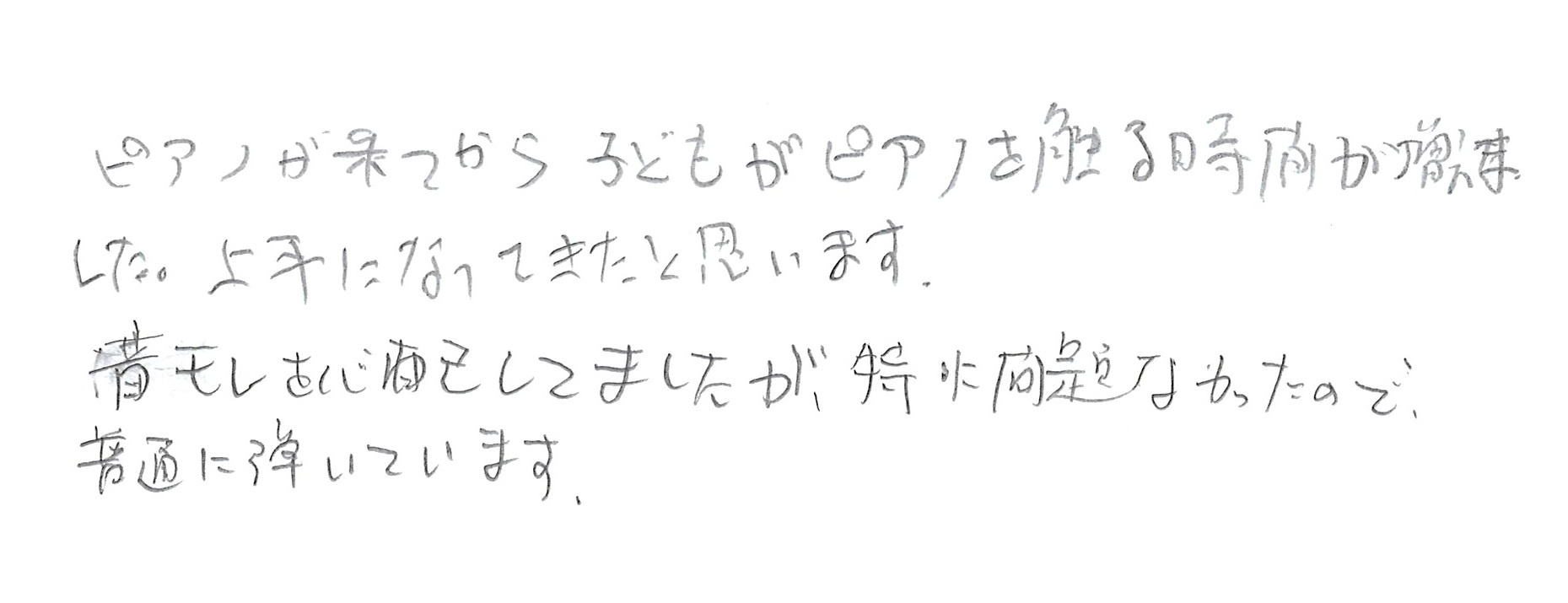 アップライトピアノご購入・中古ピアノ・ヤマハ 2025.06.15 上手になってきたと思います(中古ピアノ/ヤマハ/U10Bl/豊田市) (豊田市からのお客様) ご購入者様からのメッセージ ピアノが来てから子どもがピアノを触る時間が増えました。上手になってきたと思います。 音モレを心配してましたが、特に問題なかったので、普通に弾いています。 スタッフの対応は満足のいくものでしたか? 当社でピアノを買う決め手となったポイントをお聞かせください。 価格、品揃え、スタッフの対応 当社のSNSで、参考になったものや便利だったものはありましたか? YouTube 担当者から この度はピアノをご購入いただき、ありがとうございます。 早速お子様がピアノに触れる時間が増えて上達も感じられているとのこと、とても嬉しく思います。防音面も問題なくお使いいただけているようで、何よりです。除湿機もご用意いただいて、管理もばっちりですね!今後の調律でも、どうぞよろしくお願いいたします。