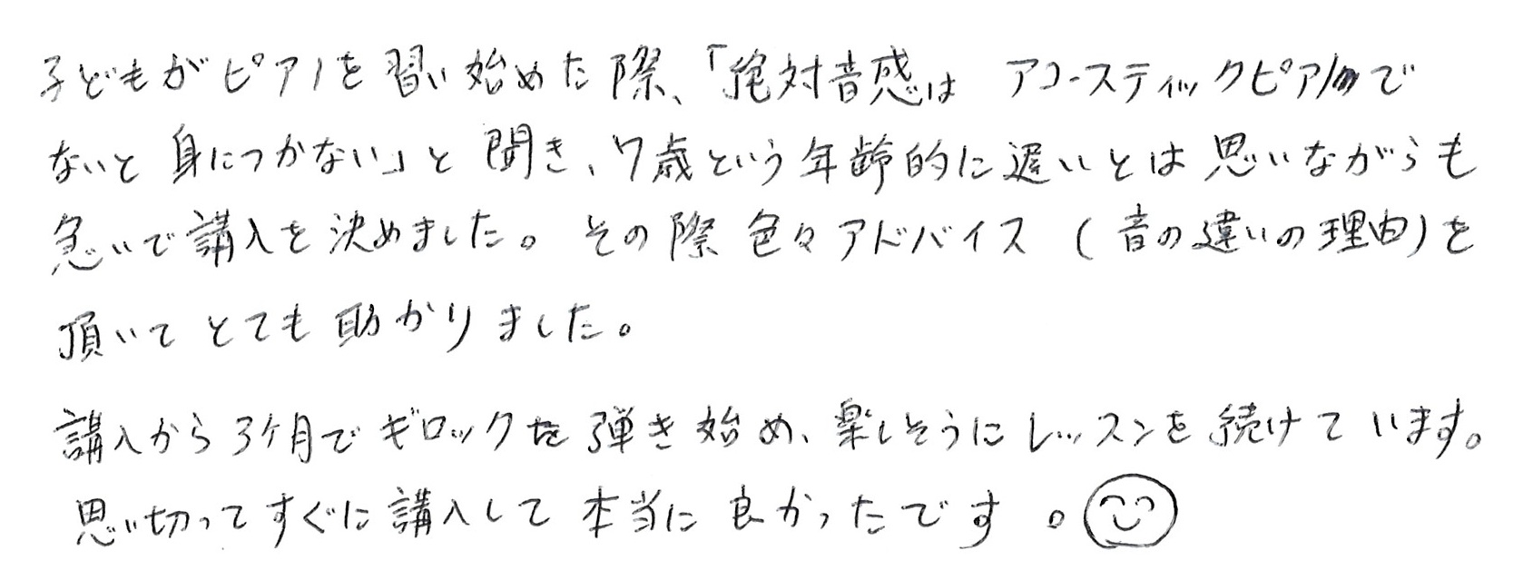 アップライトピアノご購入・中古ピアノ・ヤマハ 2025.08.03 思い切ってすぐに購入して本当に良かった(中古ピアノ/ヤマハ/U100/常滑市) (常滑市からのお客様) ご購入者様からのメッセージ 子どもがピアノを習い始めた際、「絶対音感はアコースティックピアノでないと身につかない」と聞き、7歳という年齢的に遅いとは思いながらも急いで購入を決めました。その際色々アドバイス(音の違いの理由)を頂いてとても助かりました。 購入から3ヶ月でギロックを弾き始め、楽しそうにレッスンを続けています。思い切ってすぐに購入して本当に良かったです。☺️ スタッフの対応は満足のいくものでしたか? 非常に満足 当社でピアノを買う決め手となったポイントをお聞かせください。 価格、技術面の信頼、スタッフの対応、展示ピアノの品質 当社のSNSで、参考になったものや便利だったものはありましたか? web 担当者から この度は当社にてピアノをご購入いただき、誠にありがとうございます。 大切な1台を選ぶお手伝いが出来、大変嬉しく思います。 お子様も楽しく弾いてくださっているようで何よりです! 引き続き今後ともどうぞよろしくお願いいたします。