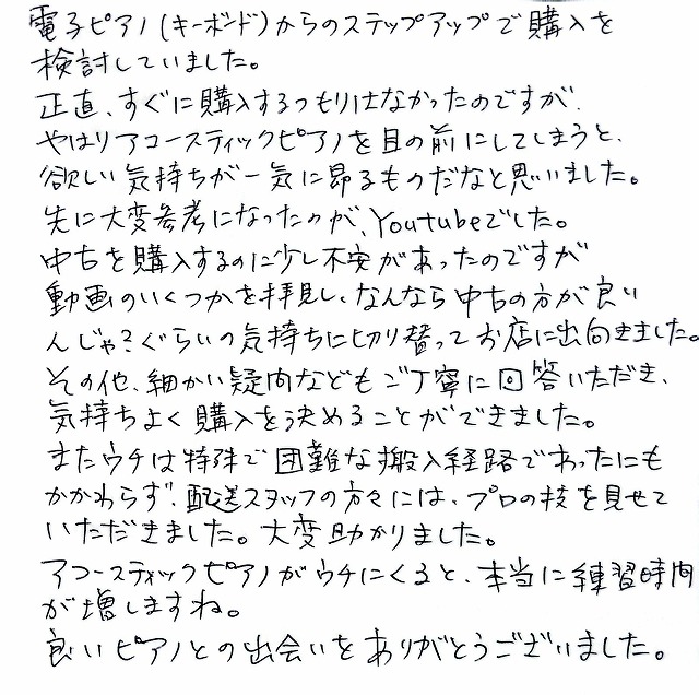 電子ピアノ(キーボード)からのステップアップで購入を検討していました。正直、すぐに購入するつもりはなかったのですが、やはりアコースティックピアノを目の前にしてしまうと、欲しい気持ちが一気に昂るものだなと思いました。