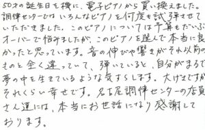 50才の誕生日を機に、電子ピアノから買い換えました。調律センターではいろんなピアノを何度も試弾させていただきました。