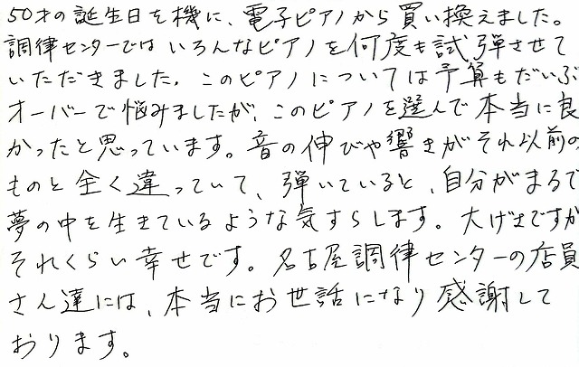 大げさですが、それくらい幸せです。名古屋ピアノ調律センターの店員さん達には、本当にお世話になり感謝しております。
