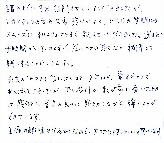 子供がピアノを習いはじめて9年ほど、電子ピアノでがんばってきましたが、アップライトが我が家に届いたときは感激し、音色の良さに感動しながら弾くことができています。