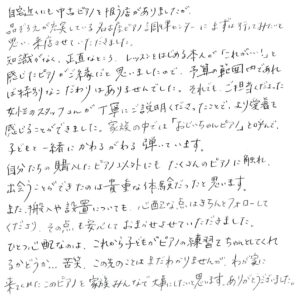 ひとつ心配なのは、これから子どもがピアノの練習をちゃんとしてくれるかどうか...苦笑。この先のことはまだわかりませんが、わが家にきてくれたこのピアノを家族みんなで大事にしたいと思います。ありがとうございました。