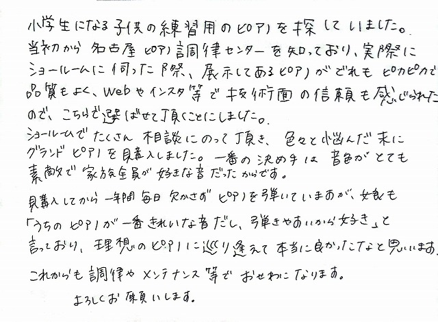 当初から名古屋ピアノ調律センターを知っており、実際にショールームに伺った際、展示してあるピアノがどれもピカピカで品質もよく、Webやインスタ等で技術面の信頼も感じられたので、こちらで選ばせて頂くことにしました。