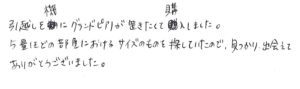 グランドピアノご購入・中古ピアノ・ヤマハ 2025.11.28 引越を機にグランドピアノを(中古ピアノ/ヤマハ/G2E/犬山市) (犬山市からのお客様) ご購入者様からのメッセージ 引越しを機にグランドピアノが置きたくて購入しました。 5畳ほどの部屋におけるサイズものを探していたので、見つかり、出会えてありがとうございました。 スタッフの対応は満足のいくものでしたか? 非常に満足 当社でピアノを買う決め手となったポイントをお聞かせください。 価格、品揃え、スタッフの対応、技術面の信頼、展示ピアノの品質 担当者から この度はピアノをご購入いただき、誠にありがとうございす。 お客様のご希望に合うようなピアノを選んでいただけたようで、良かったです。 また調律の際にはよろしくお願いいたします。
