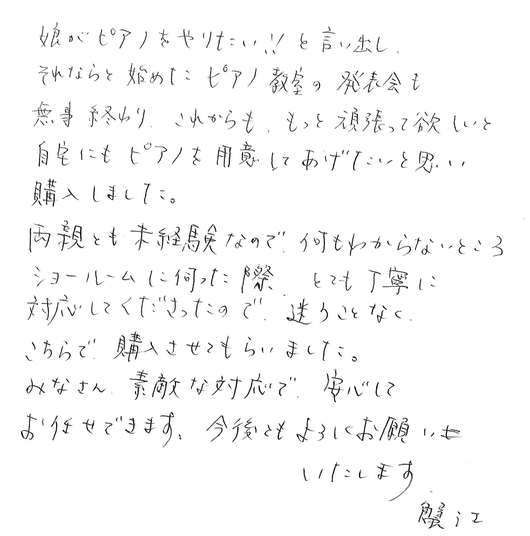 娘がピアノをやりたい!!と言い出し、それならと始めたピアノ教室の発表会も無事終わり、これからも、もっと頑張って欲しいと自宅にもピアノを用意してあげたいと思い購入しました。両親とも未経験なので、何もわからないところショールームに伺った際、とても丁寧に対応してくださったので、迷うことなくこちらで購入させてもらいました。 みなさん、素敵な対応で、安心してお任せできます。 今後ともよろしくお願いいたします。