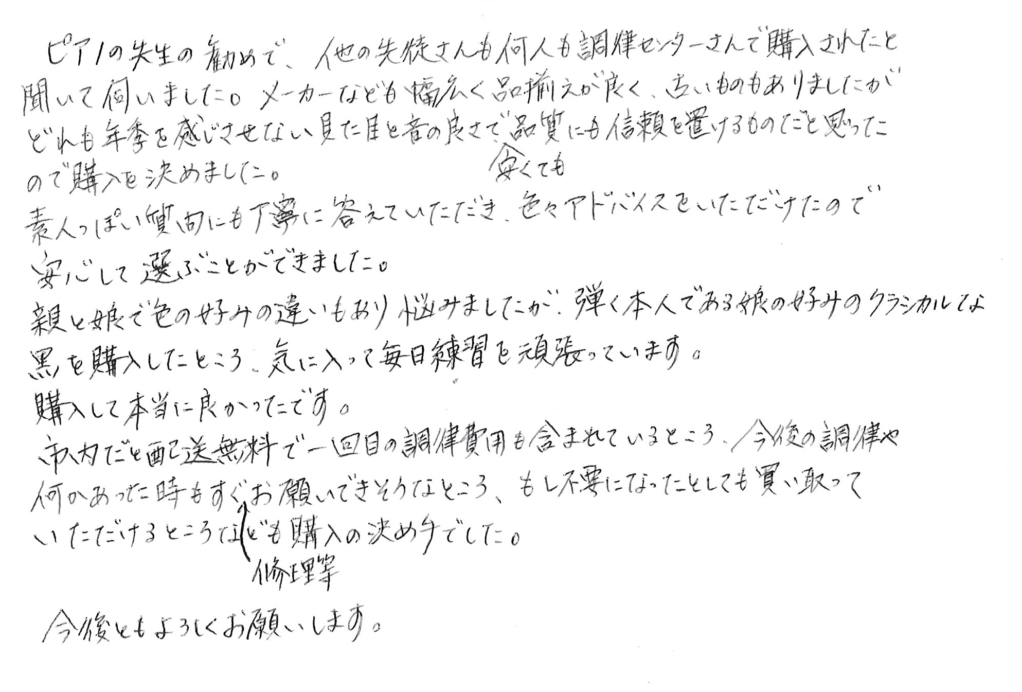 ピアノの先生の勧めで、他の生徒さんも何人も調律センターさんで購入されたと聞いて伺いました。メーカーなども幅広く品揃えが良く、古いものもありましたが、どれも年季を感じさせない見た目と音の良さで、安くても品質にも信頼を置けるものだと思ったので購入を決めました。素人っぽい質問にも丁寧に答えていただき、色々アドバイスをいただけたので、安心して選ぶことができました。